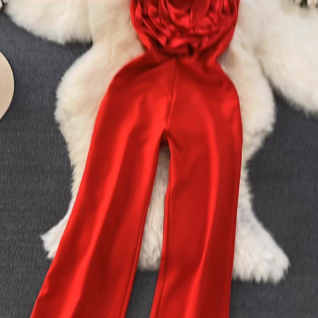 High-end celebrity temperament three-dimensional flower tube top jumpsuit casual high waist slimming straight wide-leg pants jumpsuit