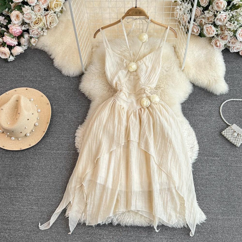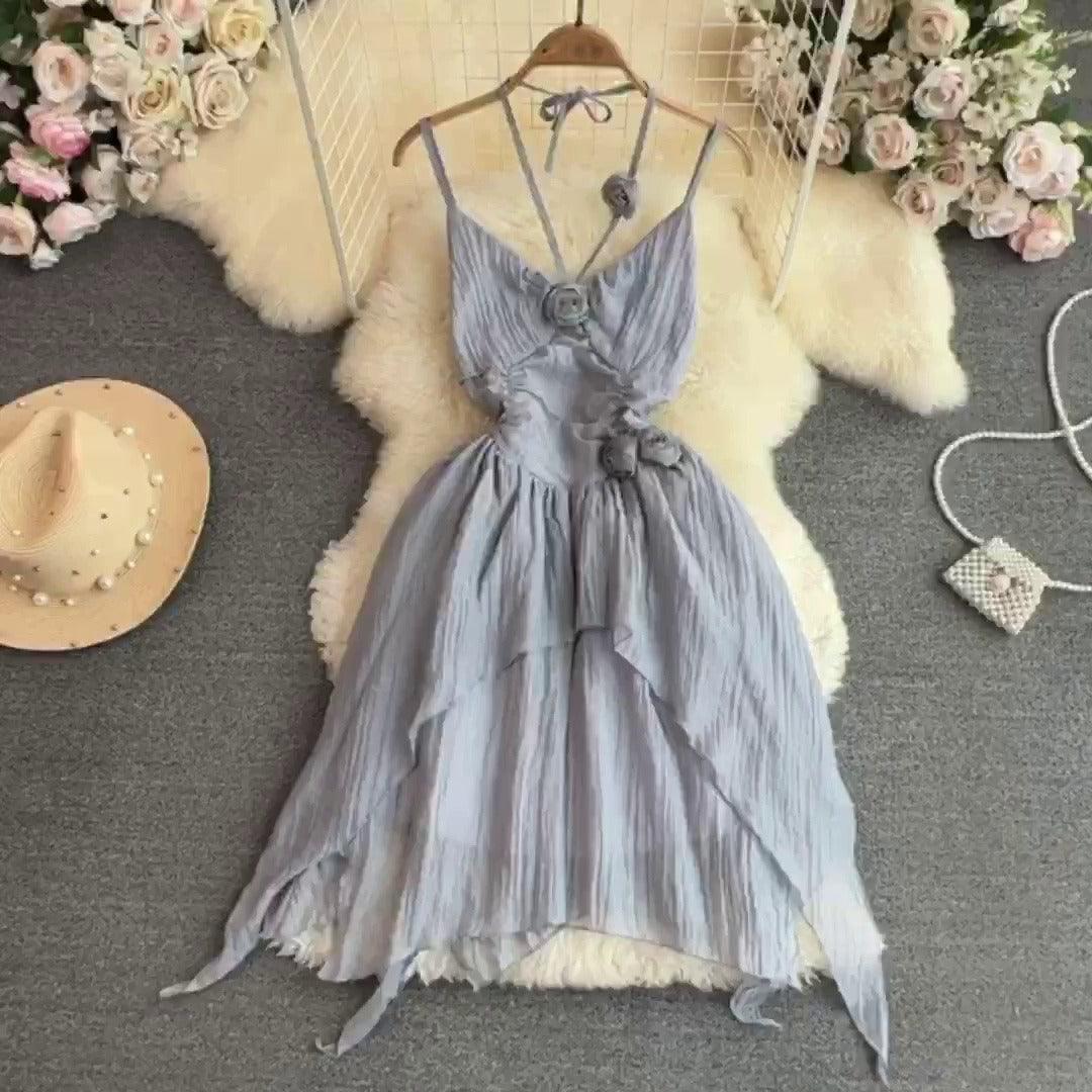 Summer pure desire hot girl hanging neck V-neck waist slimming mid-length sleeveless backless A-line irregular chiffon dress
