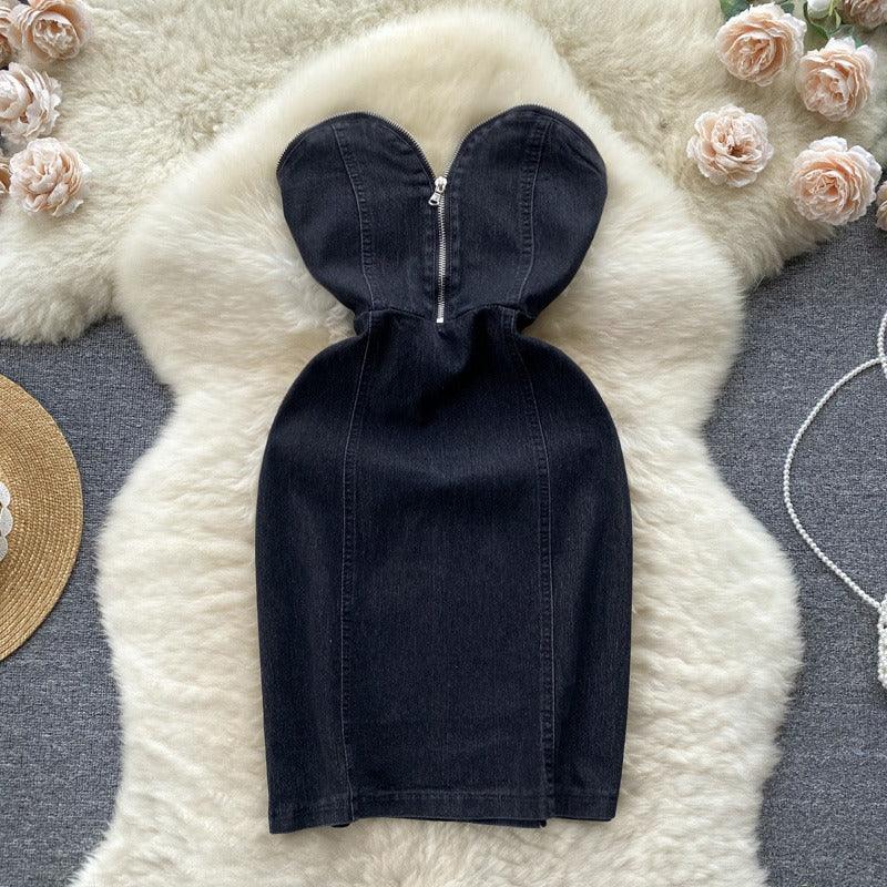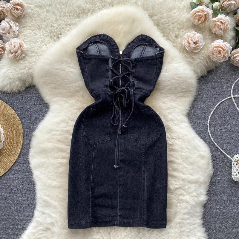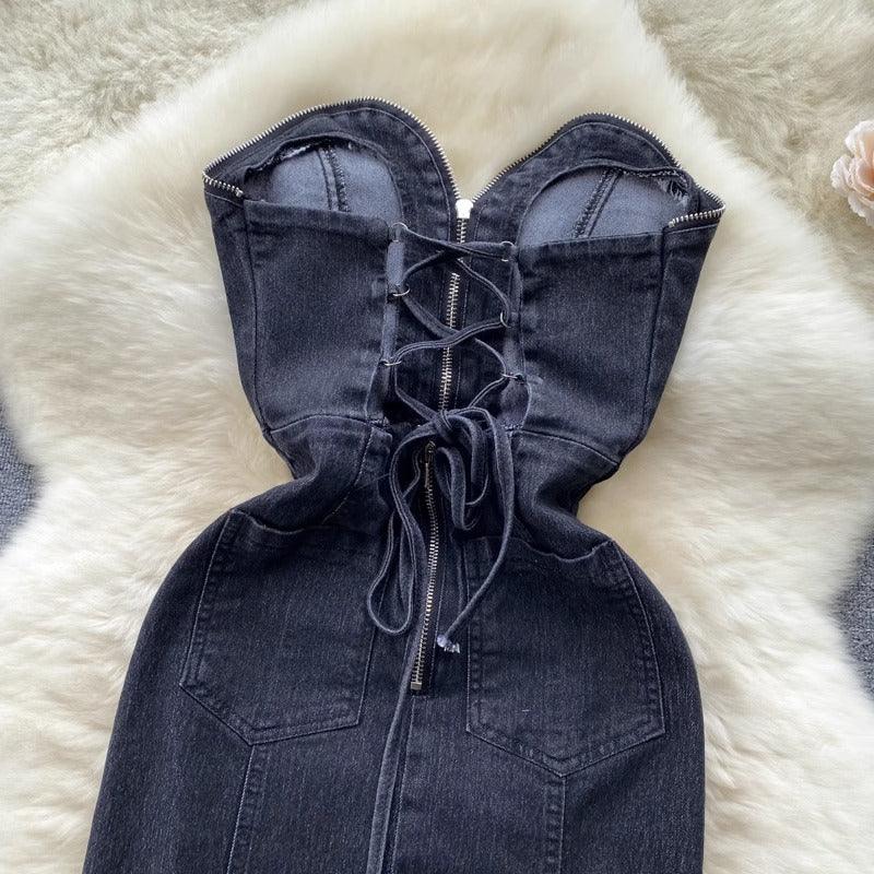 Hot girl style tube top denim dress female summer sweet cool sexy pure desire self-cultivation and figure Y2K bag hip skirt