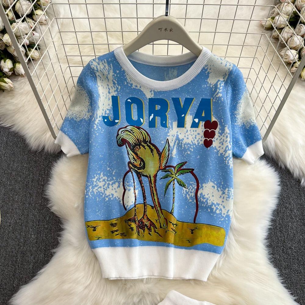 Fashion suit women's short-sleeved round neck cartoon printed sweater top two-piece set high waist slim wide leg shorts summer
