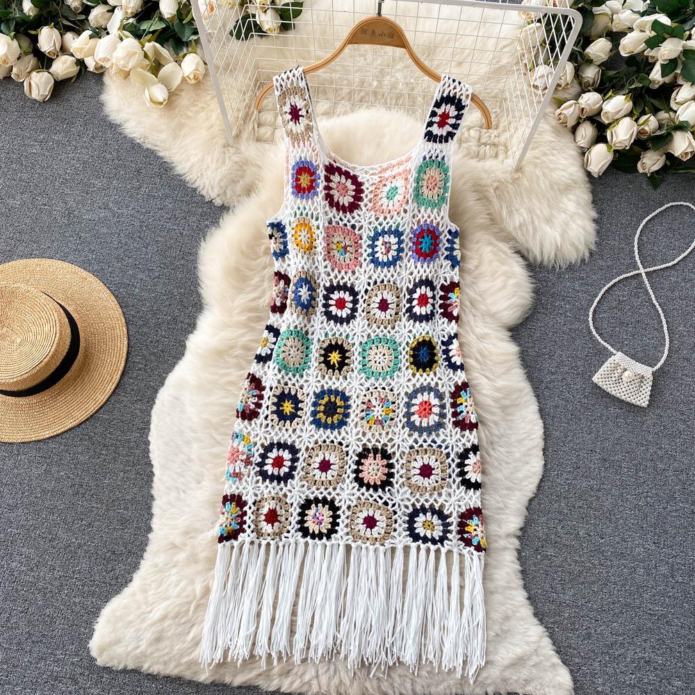 French Chic Stunning Crochet Hollow Fringe Tank Top Dress Summer Women's Small Loose Knit Skirt