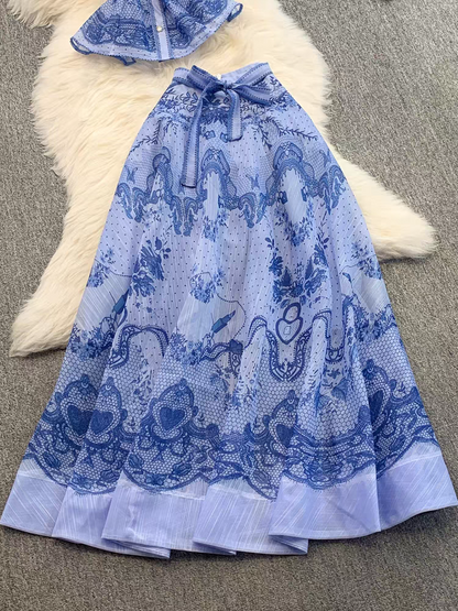 Palace style print stand collar lotus leaf sleeves art buttons short slim wide swing shirt two-piece set high waist skirt