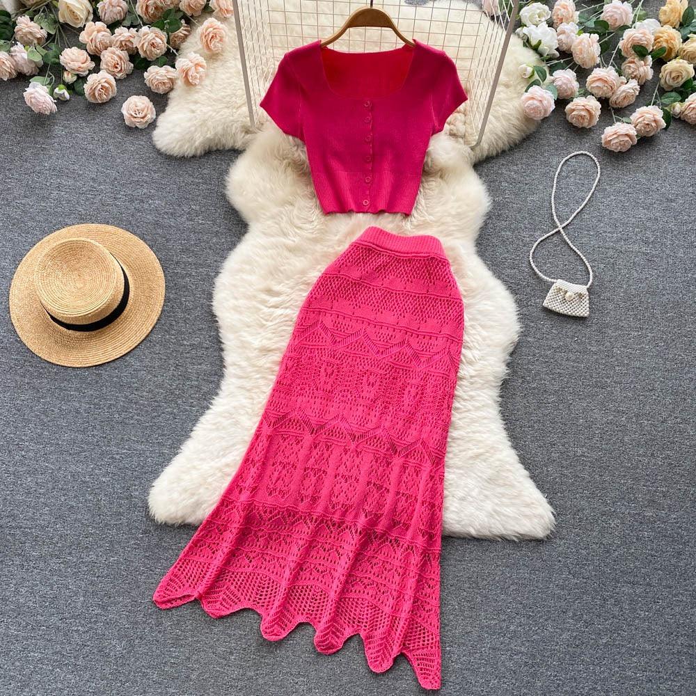 Light familiar retro suit women's short knitted cardigan + high waist hollow crochet fishtail skirt two-piece set