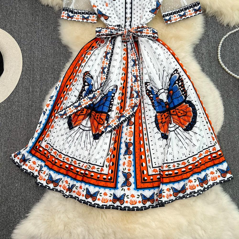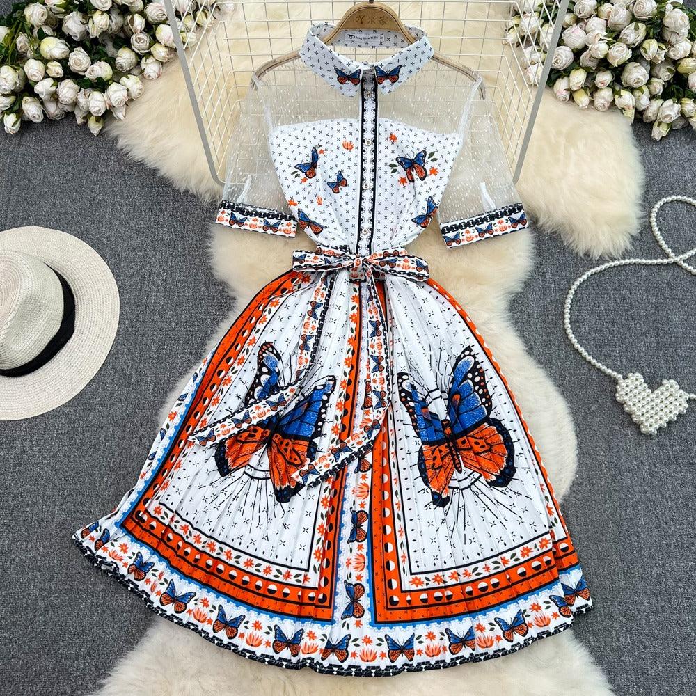 Summer Fashion Lapel Mesh Stitching Lace Waist Slimming Bow Knot Lace A-Line Pleated Shirt Dress
